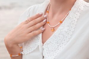 Découvrez la pièce phare de la variante orangée de la collection Aphrodite. Ce collier est bien plus qu’un simple bijou; il incarne l’harmonie et l’élégance grâce à son design minutieusement travaillé. Les perles oranges et blanches, sélectionnées avec soin, reflètent la lumière d’une manière subtile, conférant au collier une allure sophistiquée inégalée. Que vous soyez à la recherche d’un accessoire pour une occasion spéciale ou d’une touche raffinée pour compléter votre tenue quotidienne, ce collier est le choix idéal. Disponible à la demande en version choker.