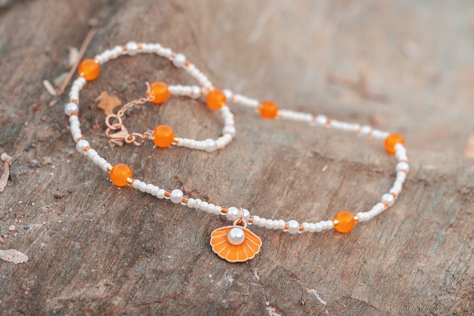 Ce collier original offre une polyvalence remarquable. Sa conception unique permet de le porter seul pour un style minimaliste, ou de l’associer aux autres éléments de la collection pour un look coordonné. Le rappel des perles oranges et blanches crée une synergie parfaite avec les autres pièces de la collection, garantissant que chaque combinaison conserve cohérence et sophistication.